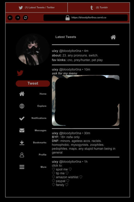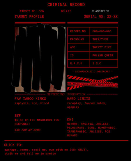 pet play. cnc. degradation. corruption. impact play. exhibition. overstim. knife play. masochism. etc.